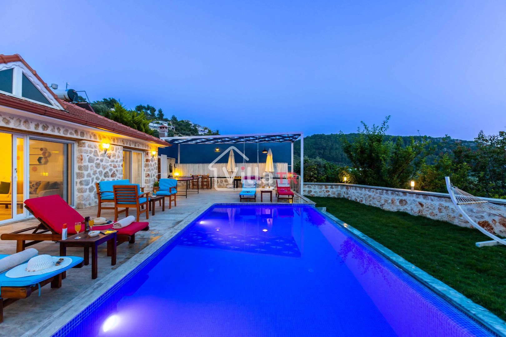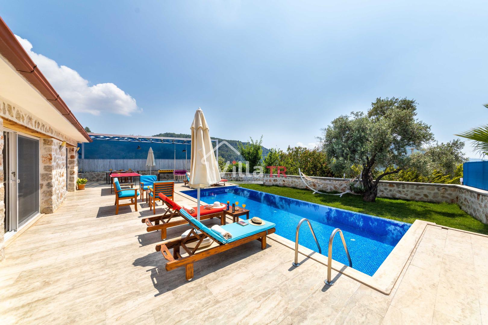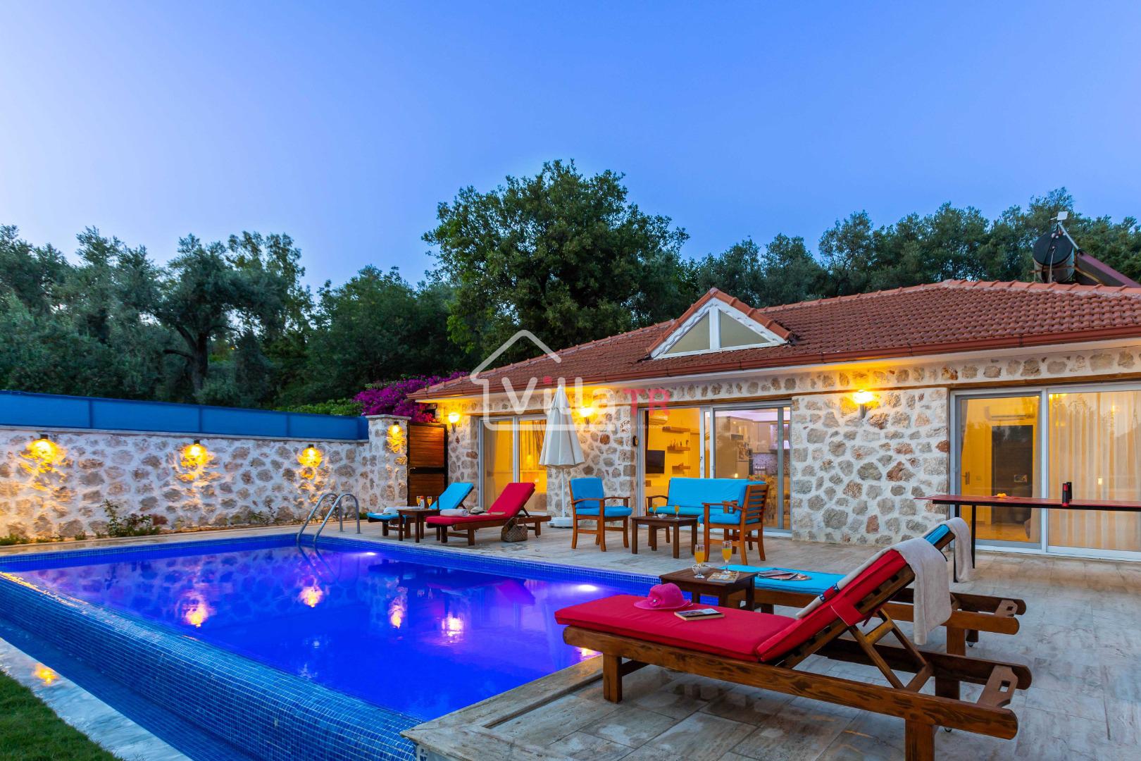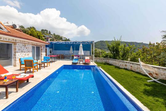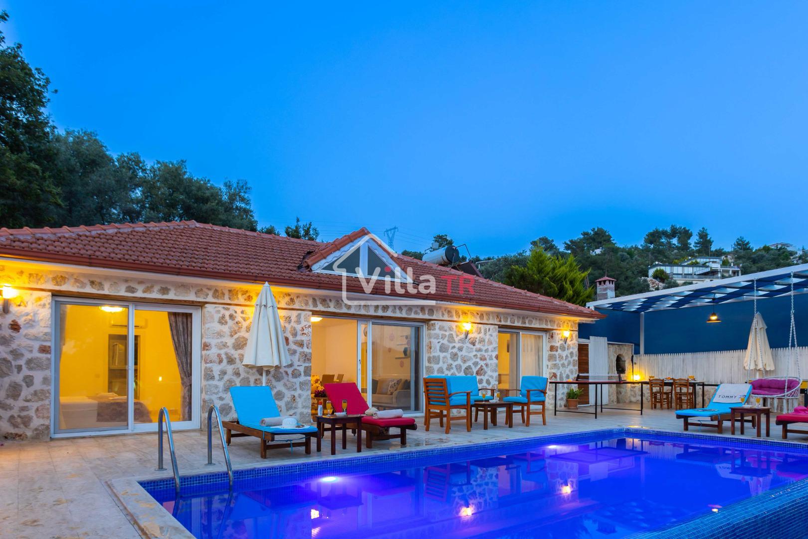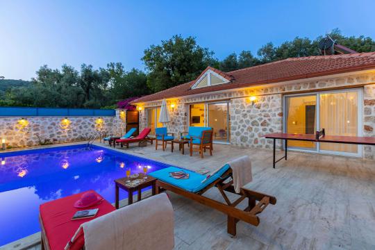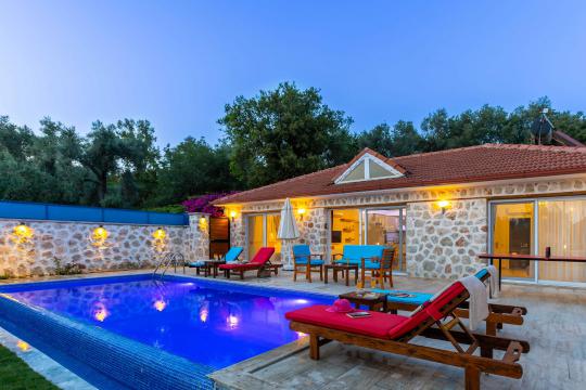 Villa Aven, Kalkan'ın Üzümlü bölgesinde konumlanmış, geniş bahçesi ve modern mimarisiyle dikkat çeken villamızdır. 2 yatak odası ve 2 banyo tuvaleti bulunan villamız 4 kişilik konaklama kapasitesiyle çekirdek aileler ve balayı çiftleri için ideal bir seçenek olarak öne çıkmaktadır. Ebeveyn yatak odasında jakuzi bulunan villamızın geniş bahçe alanında masa tenisi, langırt, hamak ve bahçe salıncağı bulunmaktadır. Korunaklı özel yüzme havuzu, konforlu şezlongları ve yaz aylarının vazgeçilmezi barbeküsüyle villamız, gözlerden uzak ve huzurlu bir tatil geçirmek isteyen misafirlerini bekliyor.