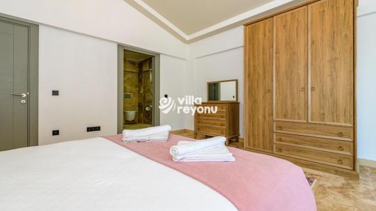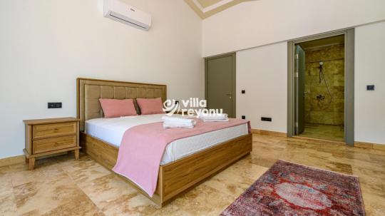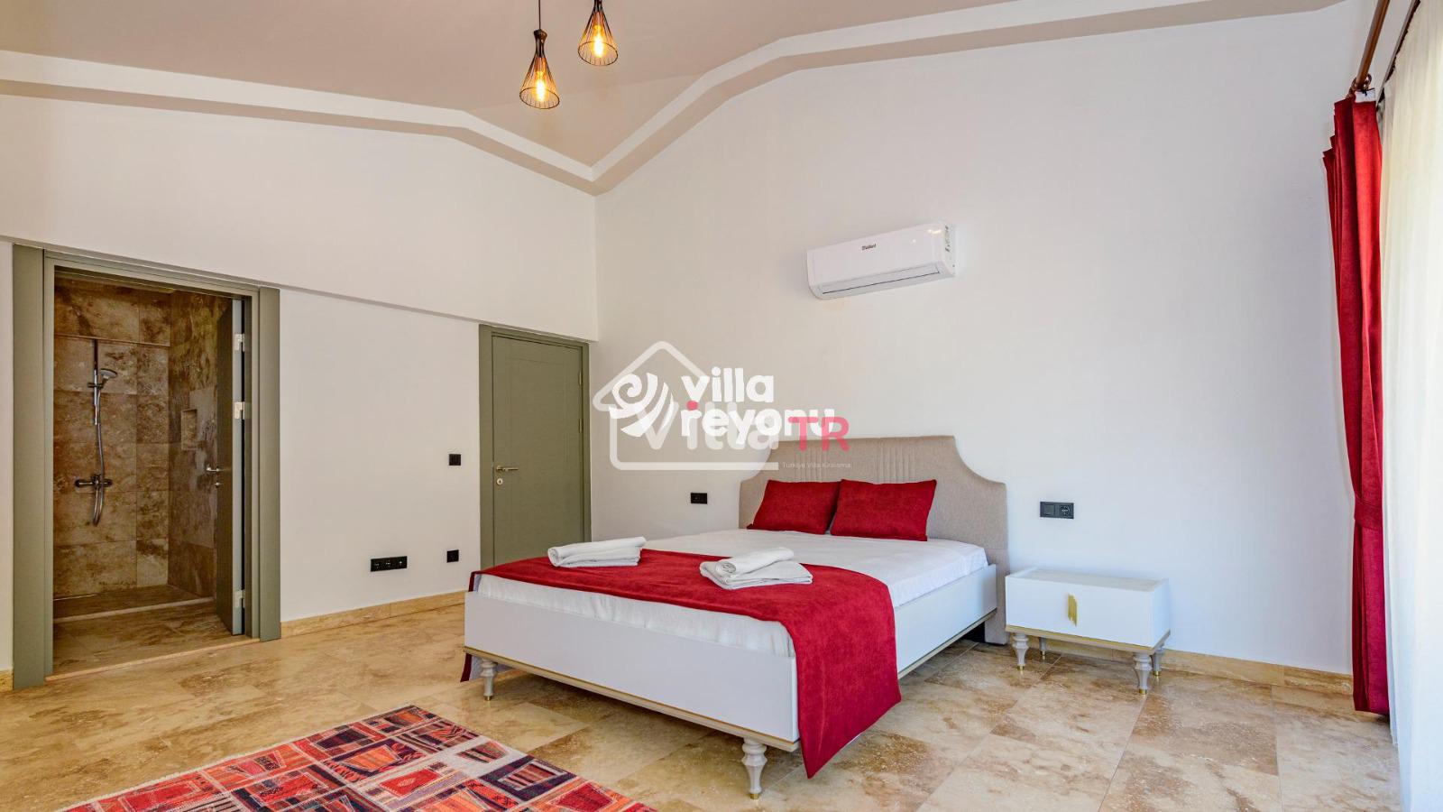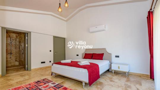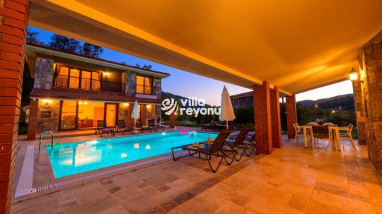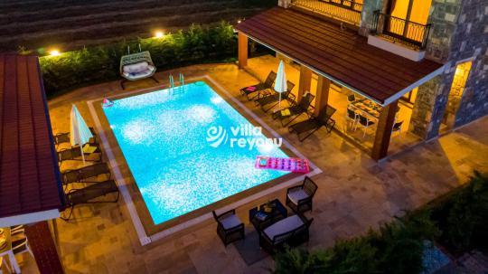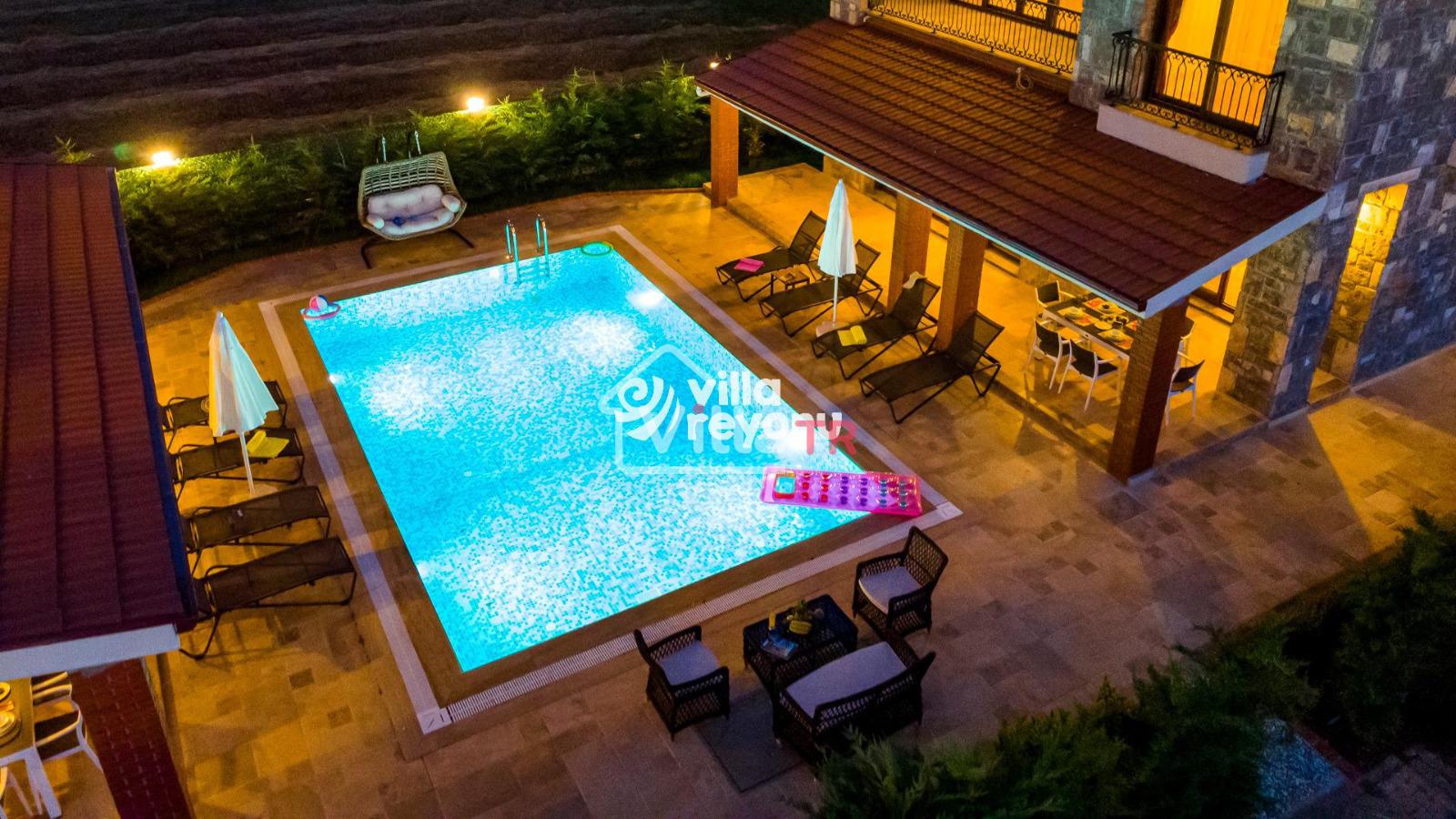 6 yatak odası, 6 banyo tuvalet bulunan villamız 12 kişilik konaklama kapasitesine sahiptir. 40 m2 büyüklüğünde özel havuzu, geniş yeşil alana sahip bahçesi, lüks bahçe takımları, salıncak, yemek masası ve güneşin tadını sessizliğin ve doğanın kalbinde tüm gün geçireceğiniz rahat şezlongları bulunmaktadır. Taş yapısı ile yazları serin, kışları serin olan villamız; lüks mobilyaları ve ferah iç dizaynı ile konforlu bir tatil için tasarlandı.