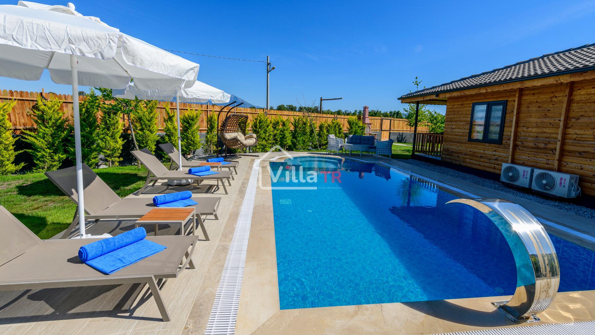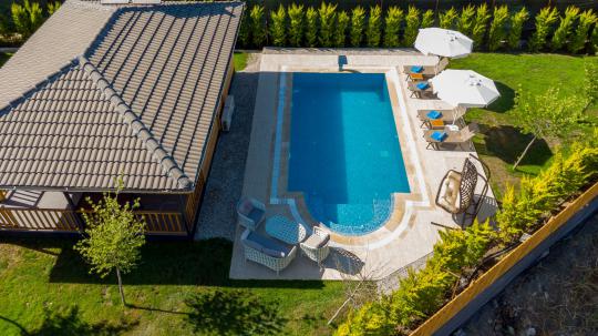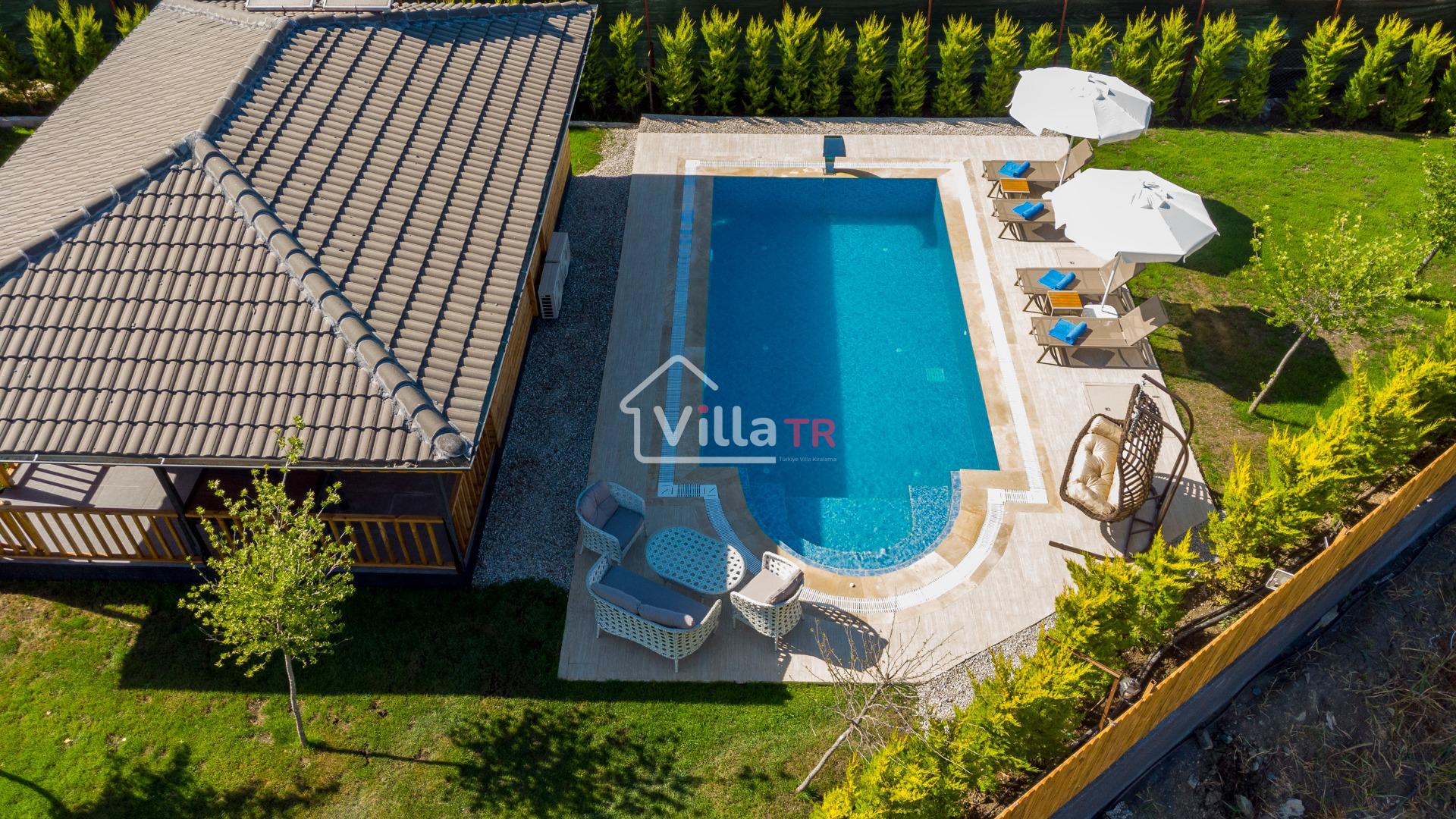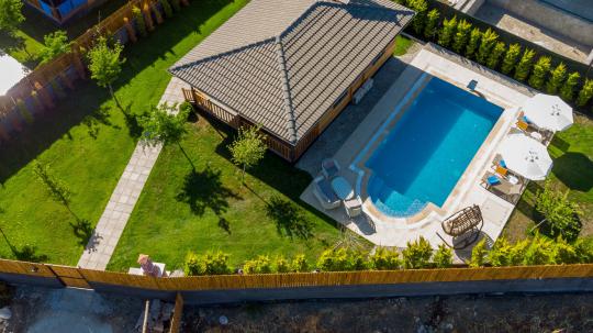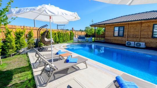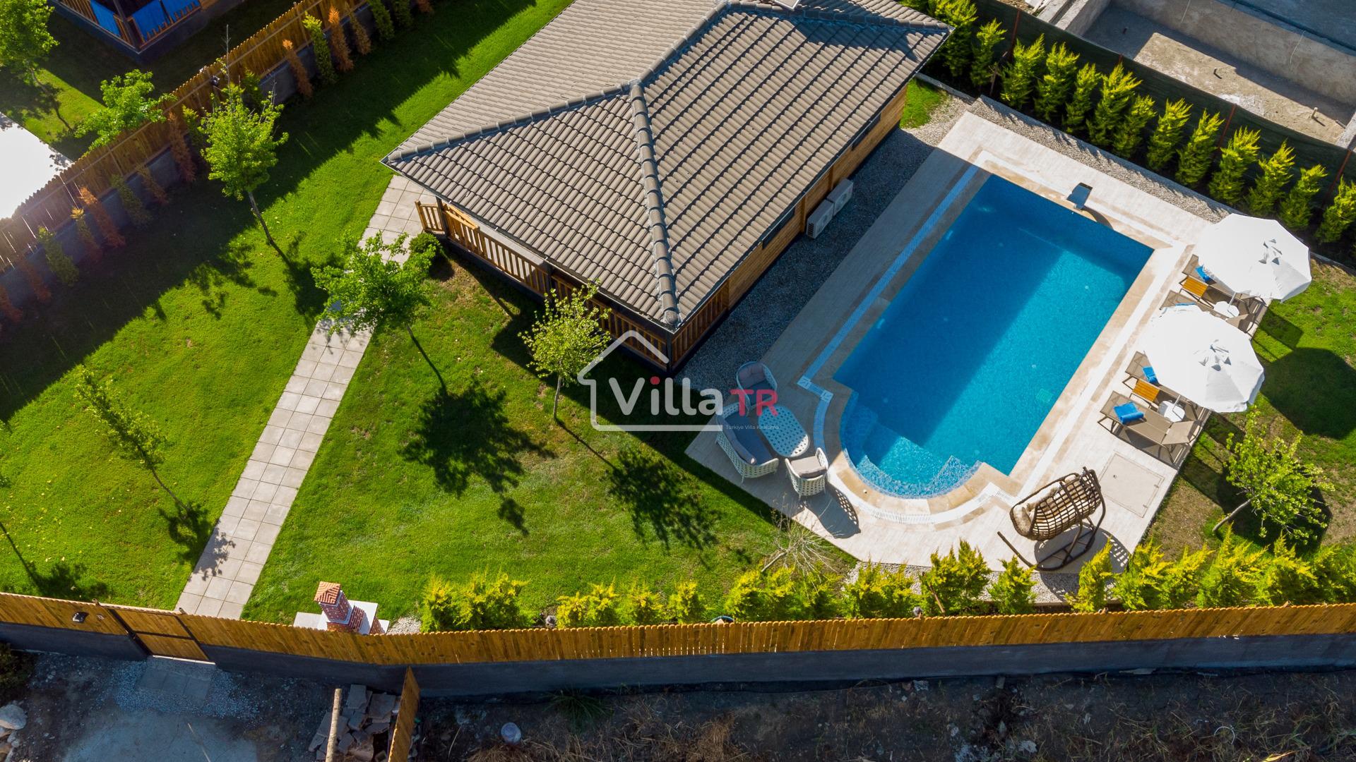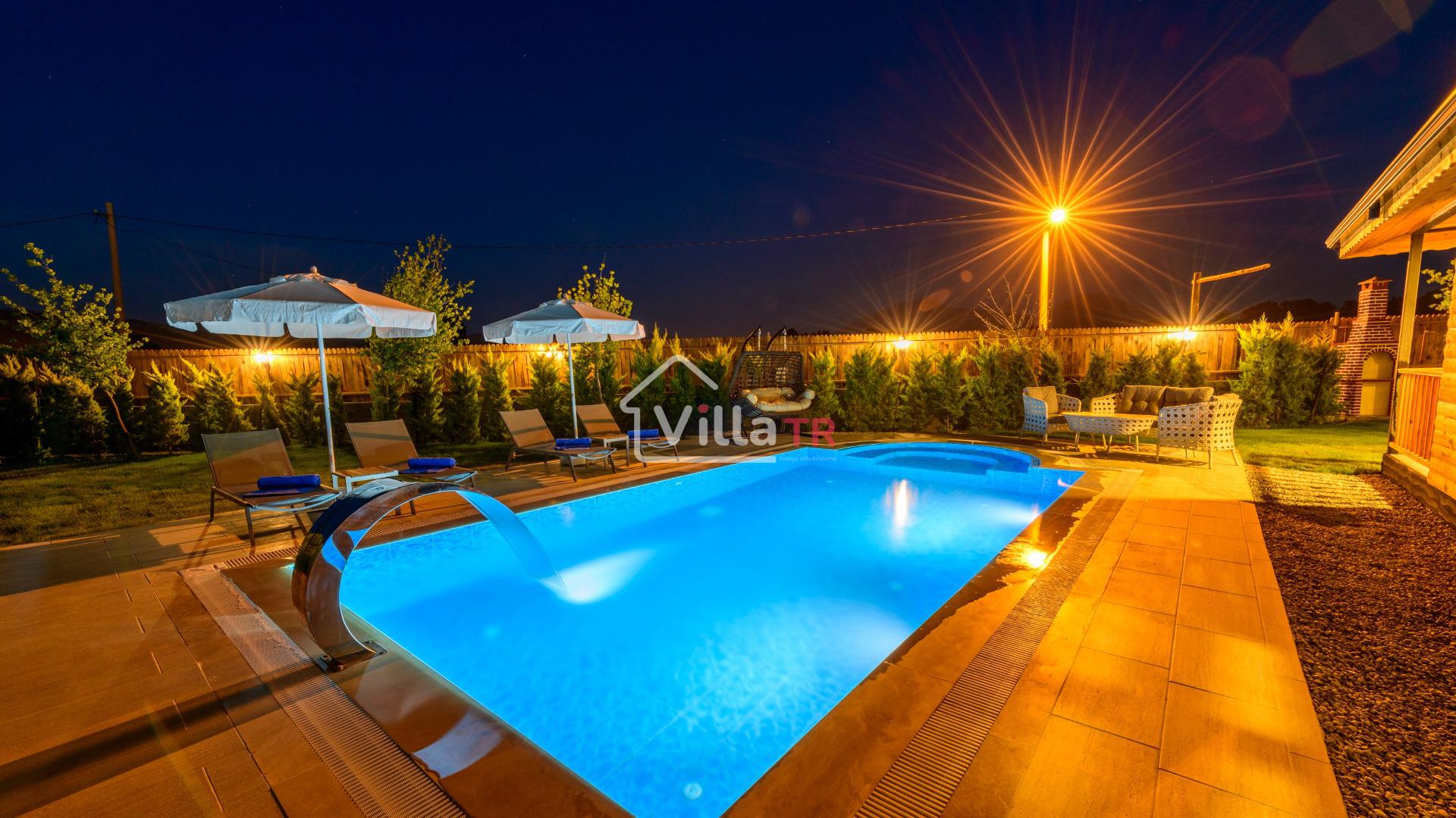Villanın en dikkat çekici özelliklerinden biri, 32 m² büyüklüğündeki korunaklı havuz alanıdır. Dışarıdan görünmeyecek şekilde tasarlanmış havuz ve güneşlenme terası, özel hayatınıza maksimum saygı gösterecek şekilde düzenlenmiştir. Bahçede yer alan oturma takımı, salıncak ve yemek masası ile açık havada keyifli vakitler geçirebilirsiniz. Barbekü alanında ailenizle unutulmaz akşam yemekleri düzenleyebilirsiniz.