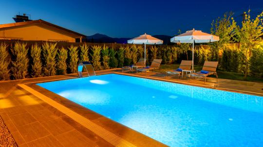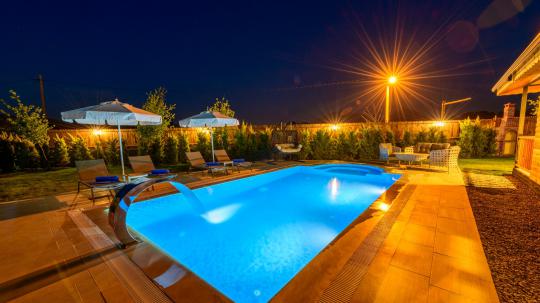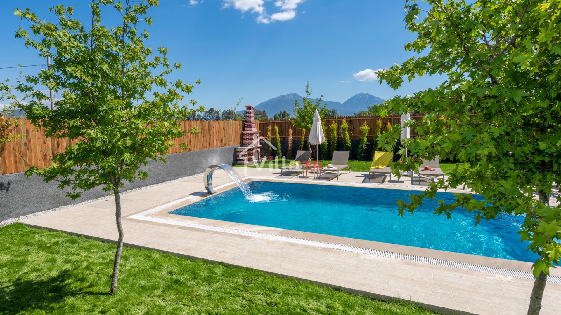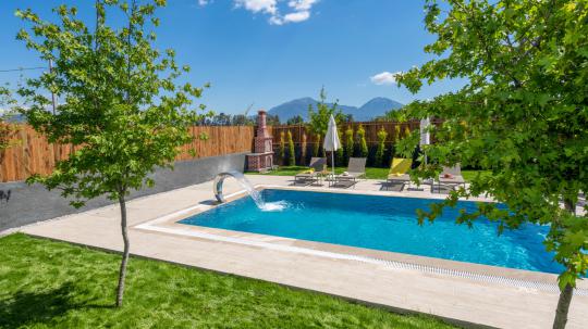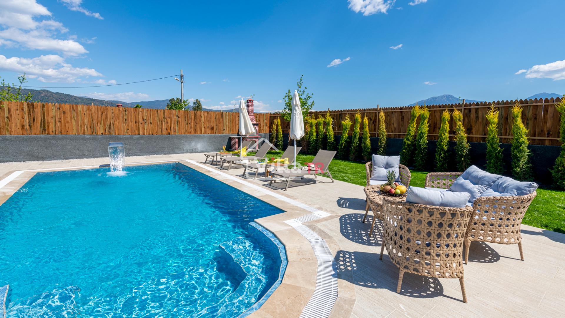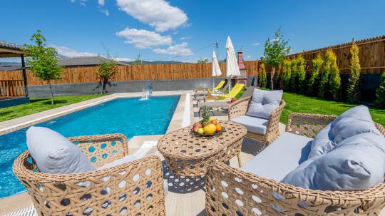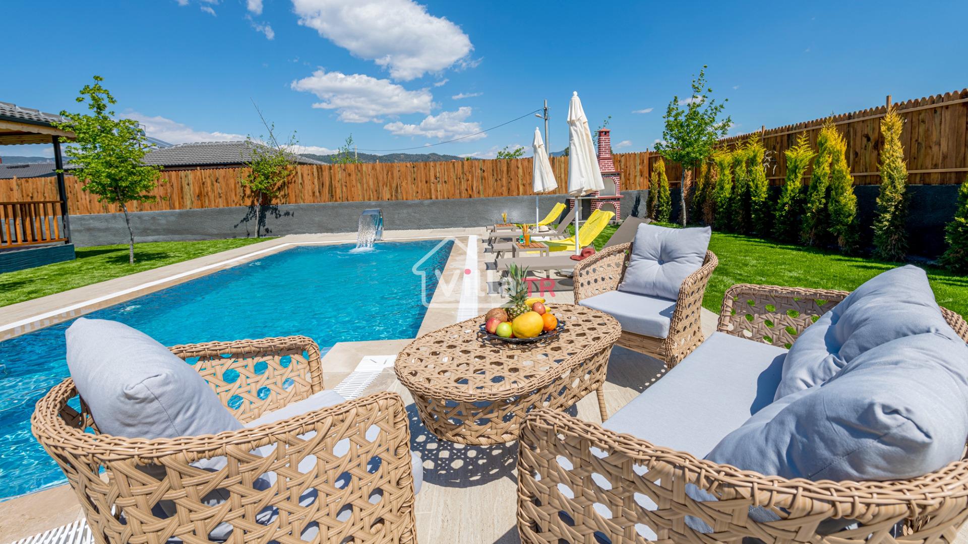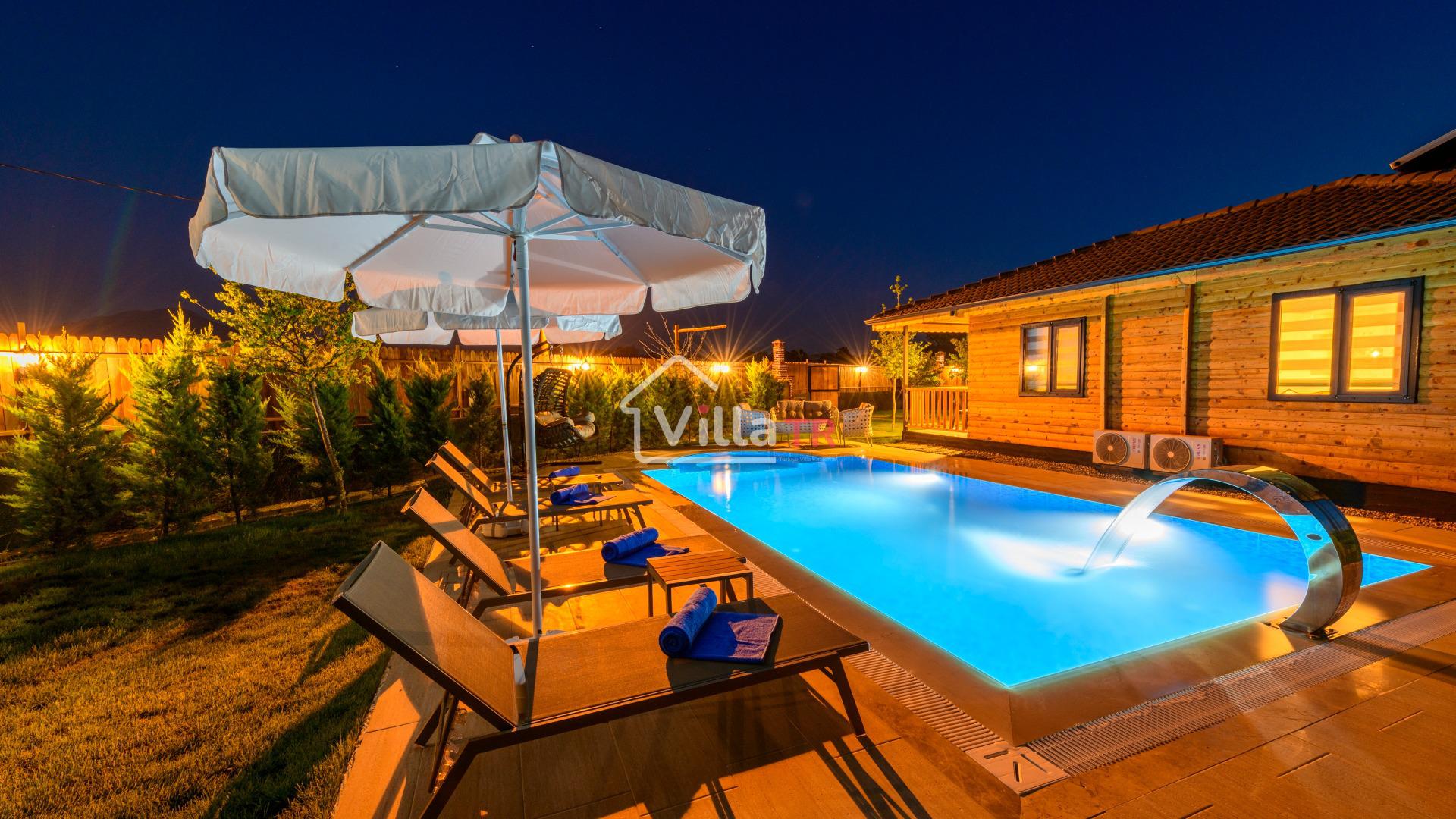 Villanın en dikkat çekici özelliklerinden biri, 32 m² büyüklüğündeki korunaklı havuz alanıdır. Dışarıdan görünmeyecek şekilde tasarlanmış havuz ve güneşlenme terası, özel hayatınıza maksimum saygı gösterecek şekilde düzenlenmiştir. Bahçede yer alan oturma takımı, salıncak ve yemek masası ile açık havada keyifli vakitler geçirebilirsiniz. Barbekü alanında ailenizle unutulmaz akşam yemekleri düzenleyebilirsiniz.