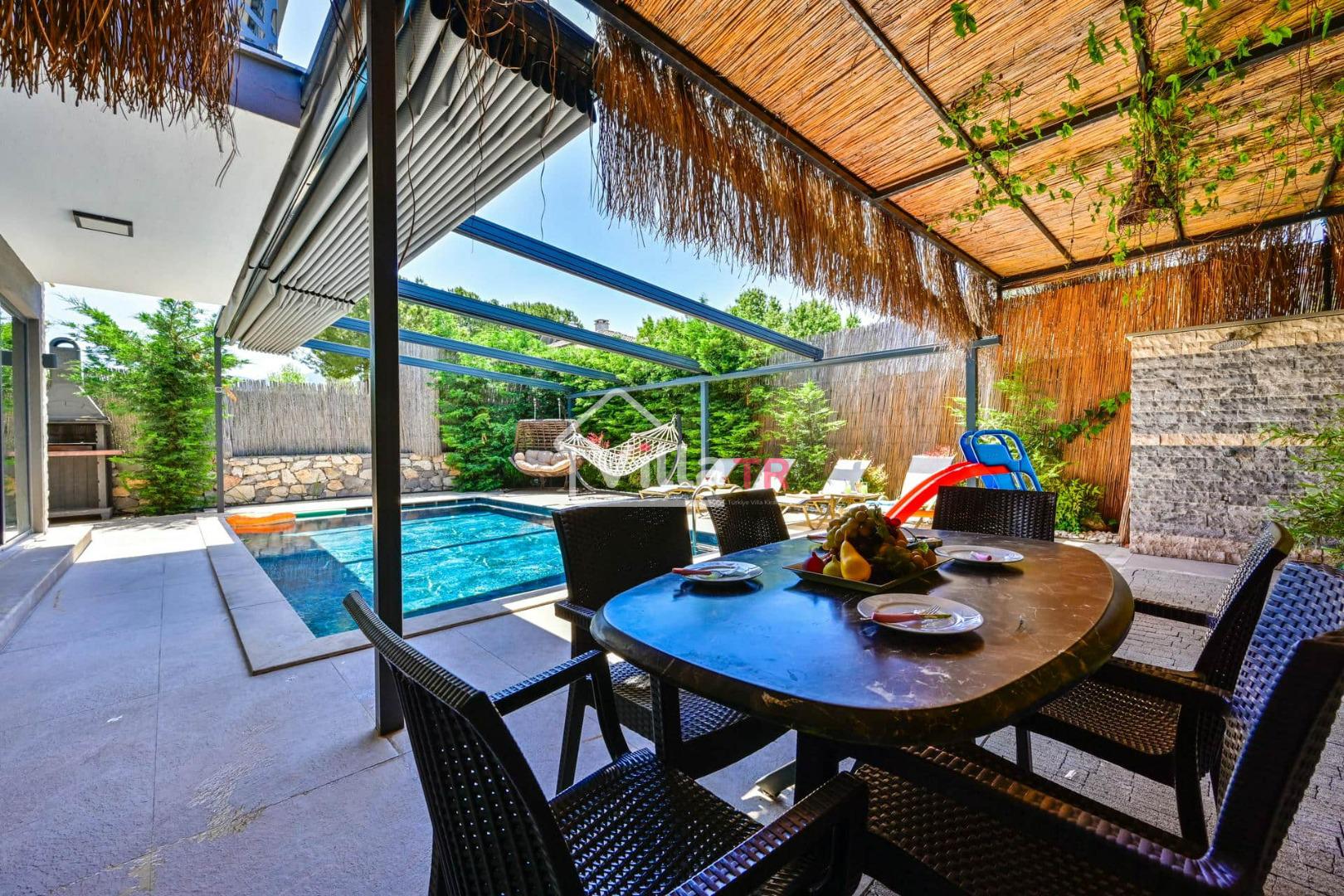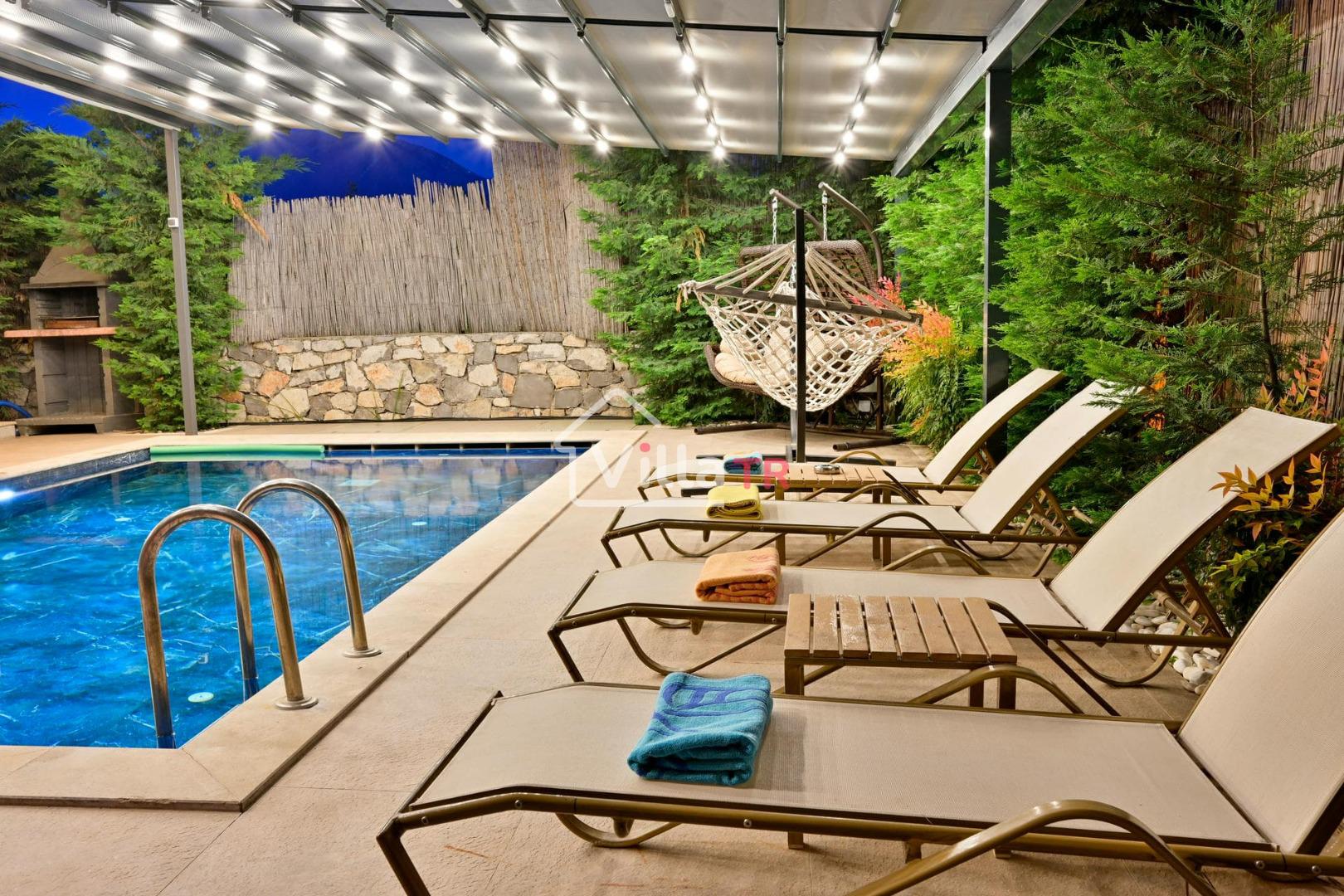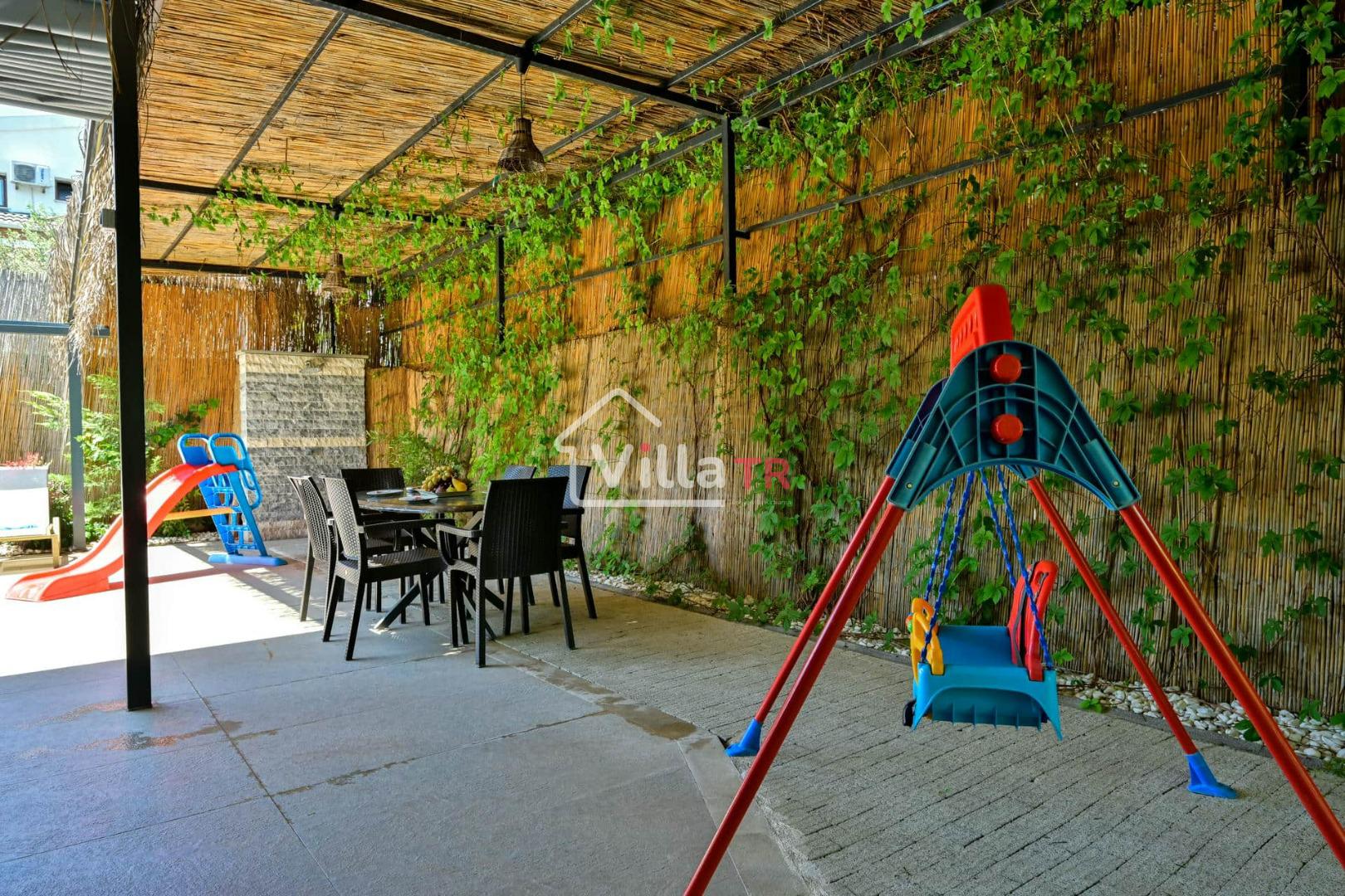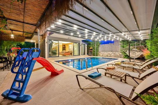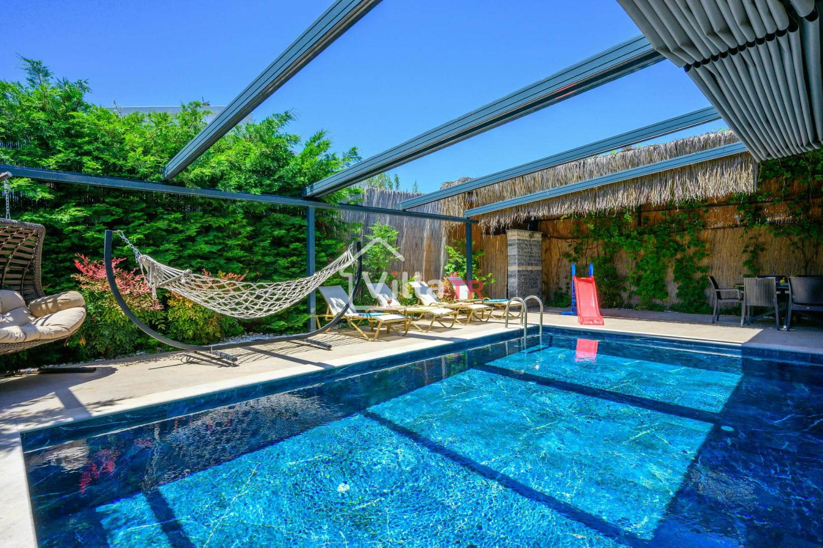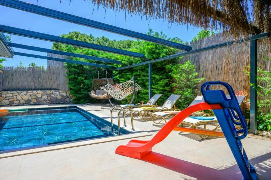 Dış mekânda sizi bekleyen özel havuz tamamen korunaklıdır. Havuz başında 6 kişilik oturma grubu, şezlonglar, büyük şemsiyeler ve hamak gibi dinlenme alanları yer alır. Bahçede çocuklar için oyun alanı bulunur, bu da özellikle çocuklu aileler için büyük bir artıdır.