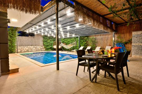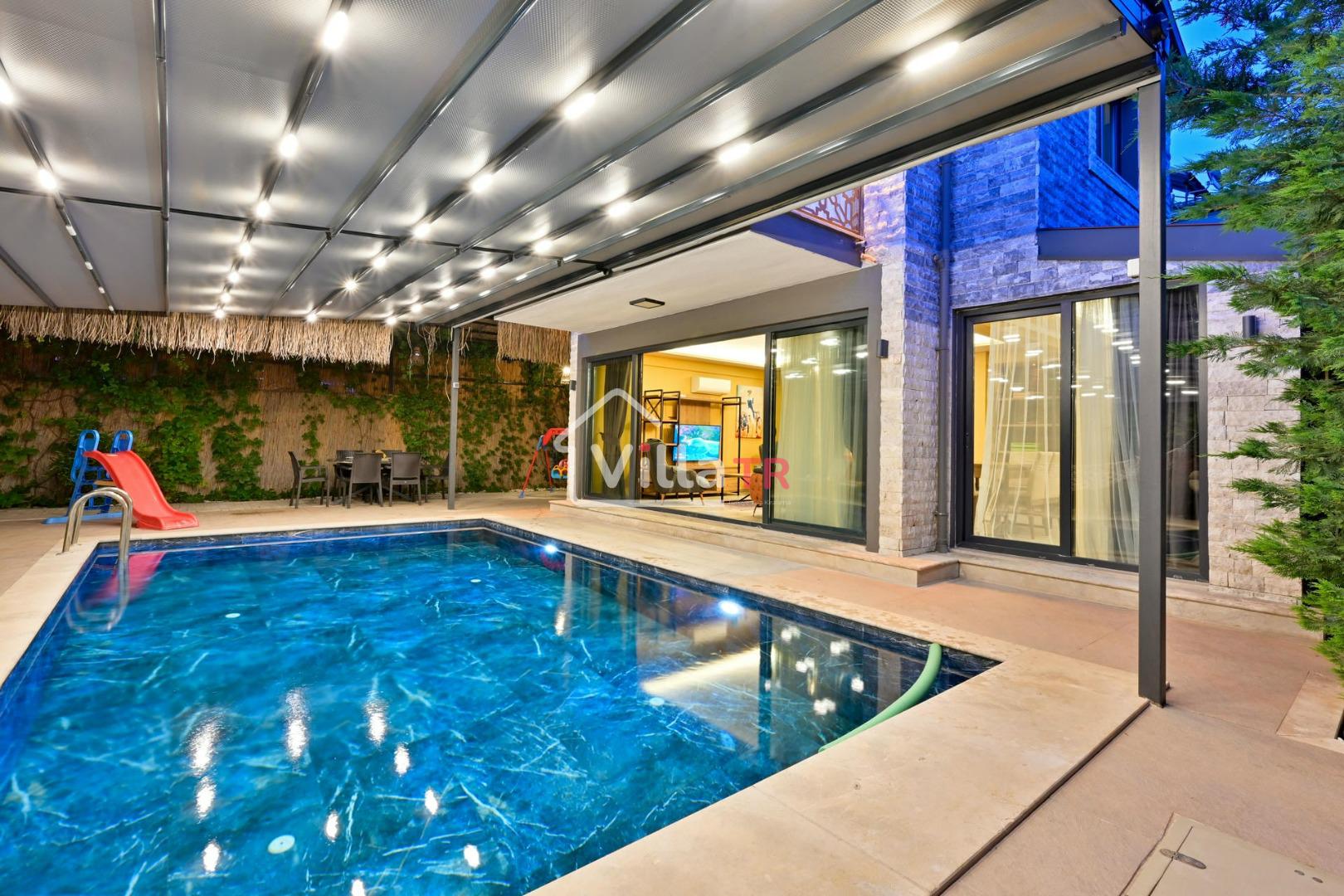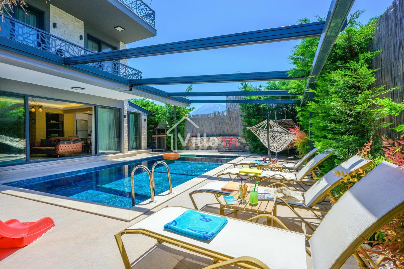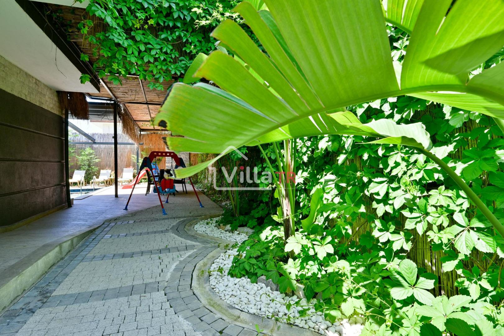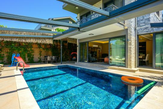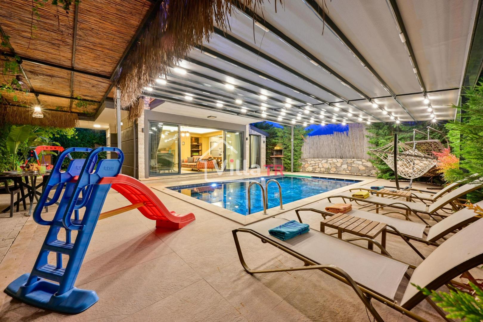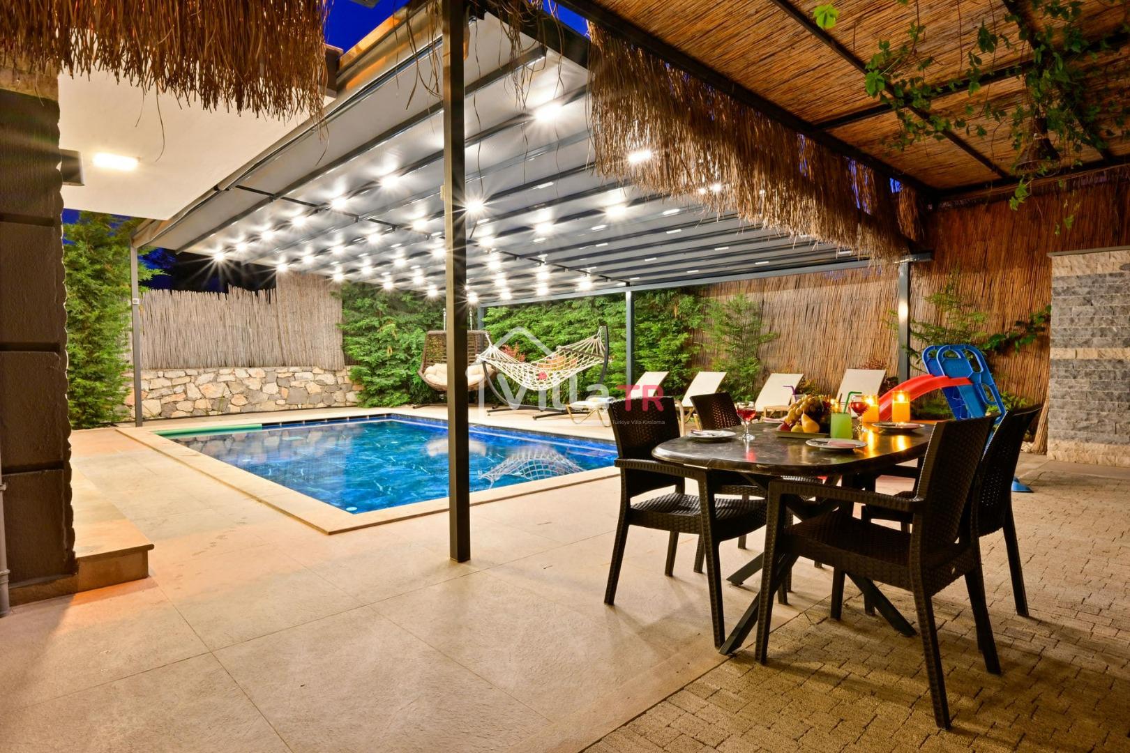 Dış mekânda sizi bekleyen özel havuz tamamen korunaklıdır. Havuz başında 6 kişilik oturma grubu, şezlonglar, büyük şemsiyeler ve hamak gibi dinlenme alanları yer alır. Bahçede çocuklar için oyun alanı bulunur, bu da özellikle çocuklu aileler için büyük bir artıdır.