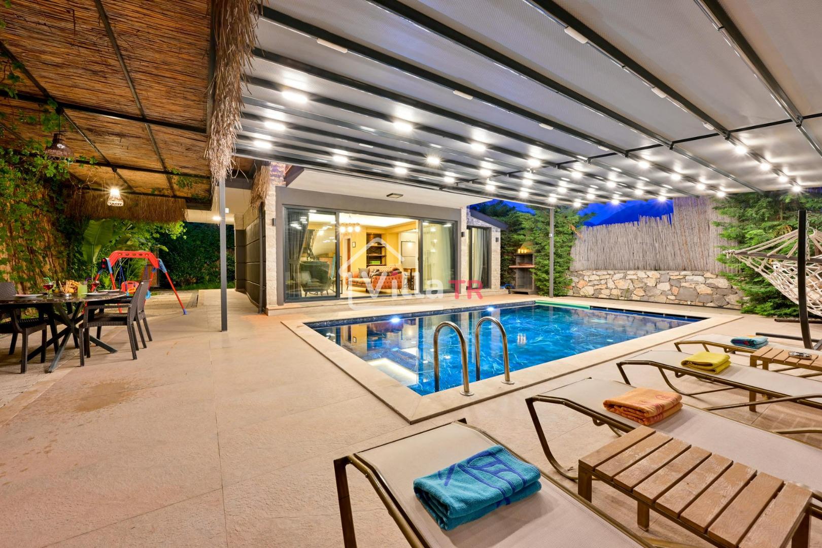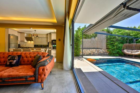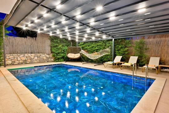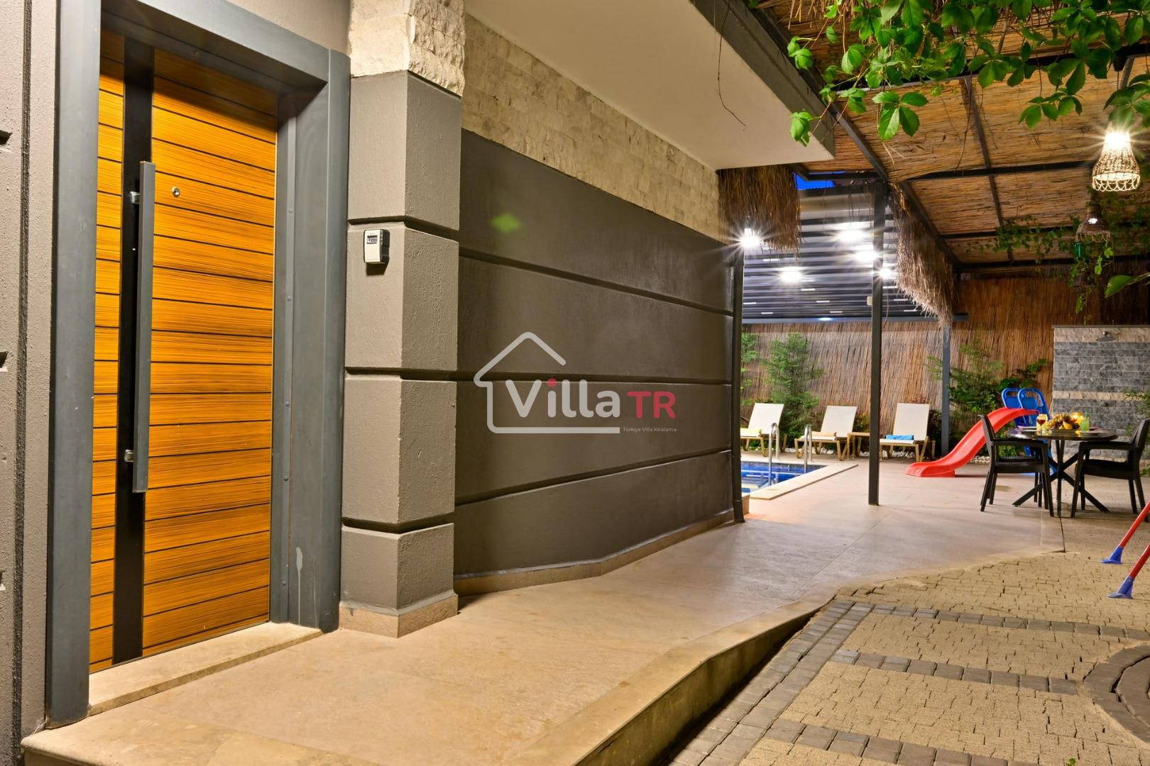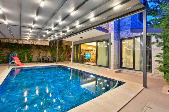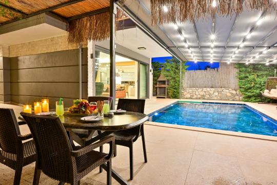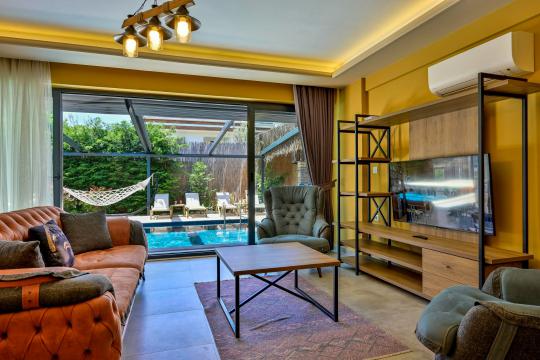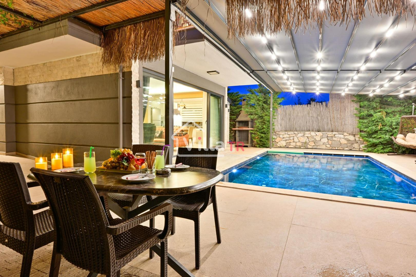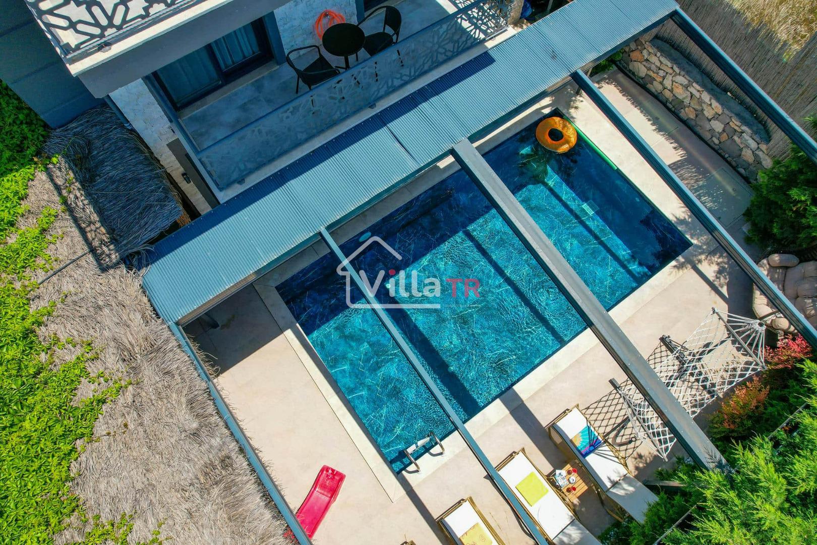 Dış mekânda sizi bekleyen özel havuz tamamen korunaklıdır. Havuz başında 6 kişilik oturma grubu, şezlonglar, büyük şemsiyeler ve hamak gibi dinlenme alanları yer alır. Bahçede çocuklar için oyun alanı bulunur, bu da özellikle çocuklu aileler için büyük bir artıdır.