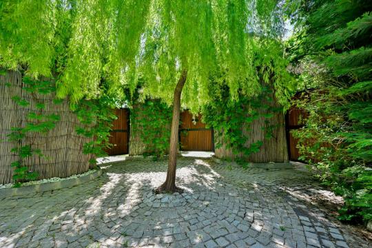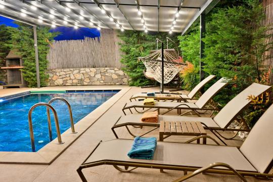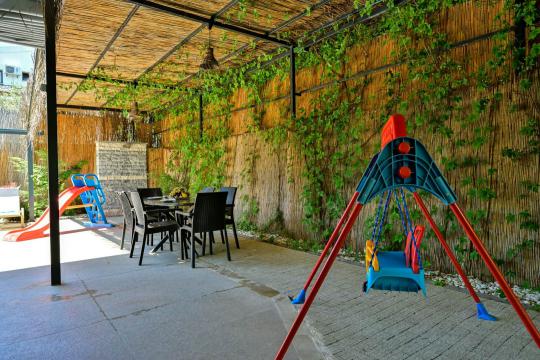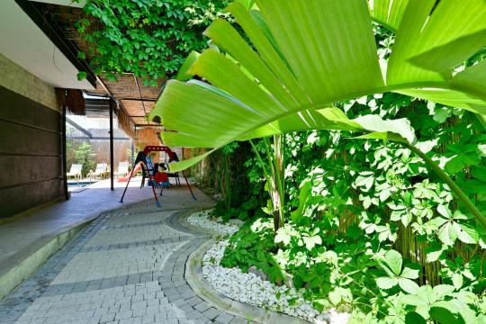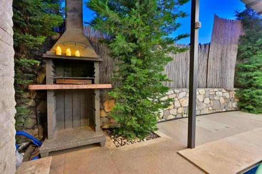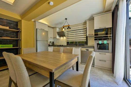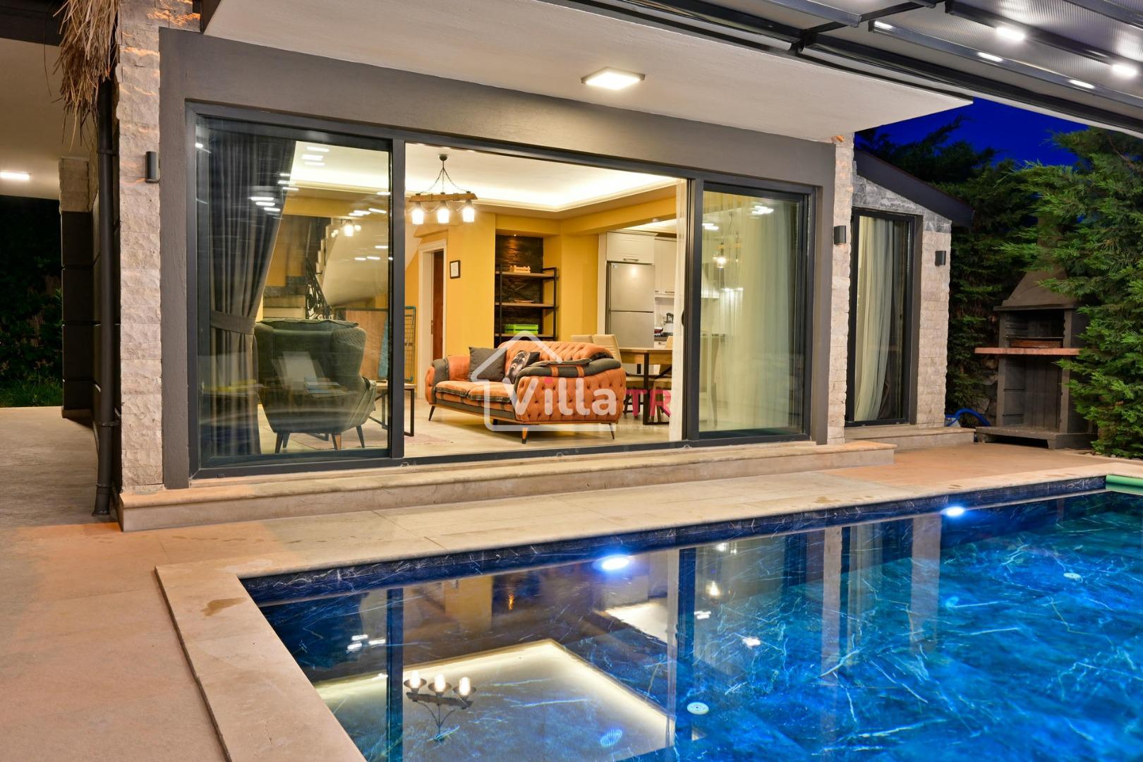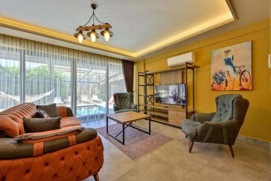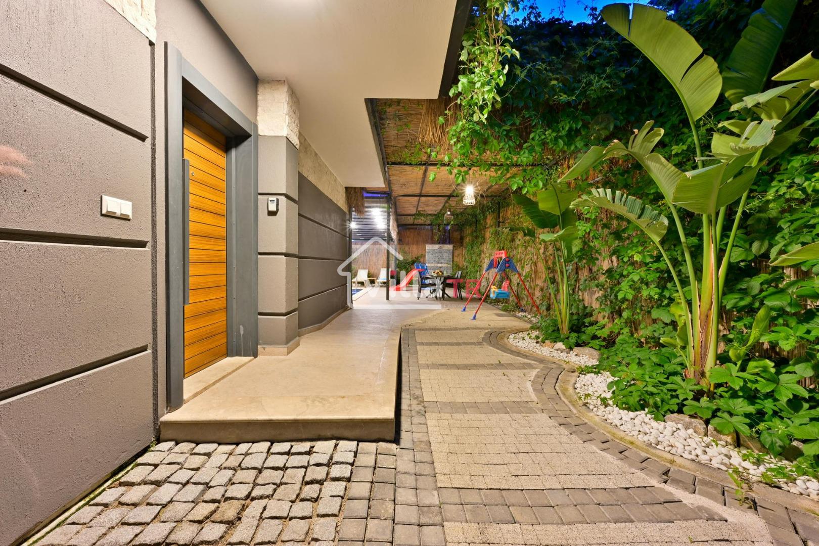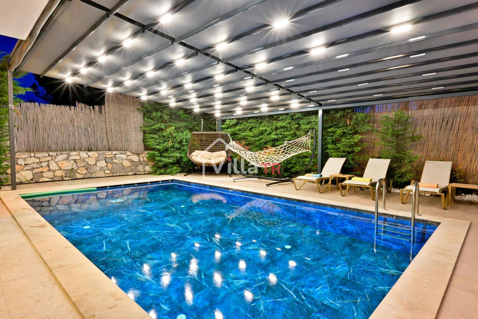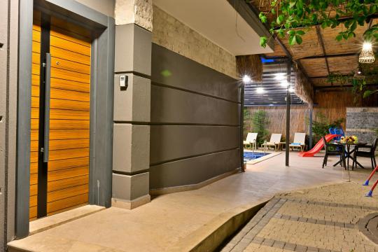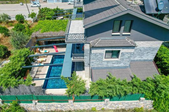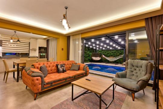 Dış mekânda sizi bekleyen özel havuz tamamen korunaklıdır. Havuz başında 6 kişilik oturma grubu, şezlonglar, büyük şemsiyeler ve hamak gibi dinlenme alanları yer alır. Bahçede çocuklar için oyun alanı bulunur, bu da özellikle çocuklu aileler için büyük bir artıdır.