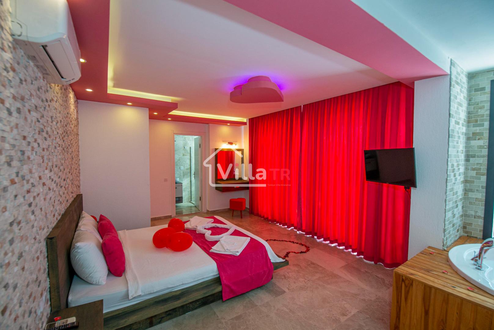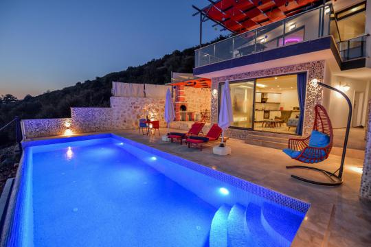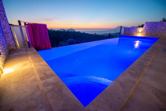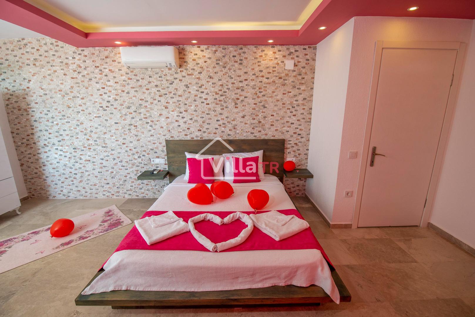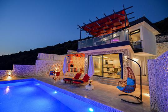 Villamız Antalya Kaş/Kalkan’da Üzümlü mevkiinde yer almaktadır. Size doğayla baş başa bir tatil imkanı sunan, etrafı ormanlarla çevrili ve tertemiz havasıyla cazibe merkezi haline gelmiş Üzümlü köyünün en güzel manzaralarından birine konumlandırılmıştır. Dilediğinizde evinizden çıkıp 10 dakika içerisinde popüler turistik alanlara trafiğe takılmadan ulaşabilmeniz bakımından oldukça avantajlı bir balayı villasıdır.1 yatak odası, 1 banyo tuvalet bulunan villamız 2 kişilik konaklama kapasitesine sahiptir. 28 m2 tam korunaklı özel havuzu, şirin bir bahçesi, bahçesinde yemek masası, oturma takımı, salıncak ve barbeküsü bulunmaktadır. Yatak odası üst katta olan villamız, jakuzi ve yatak odasından çıkılabilen manzaralı bir terasa sahiptir. Şık dış mimarisi ve modern iç tasarımıyla balayı çiftlerimizin en özel anlarını unutulmaz kılmak için tasarlandı.