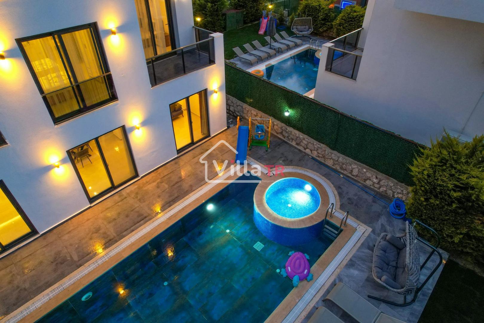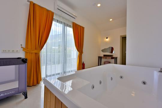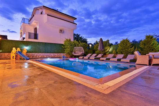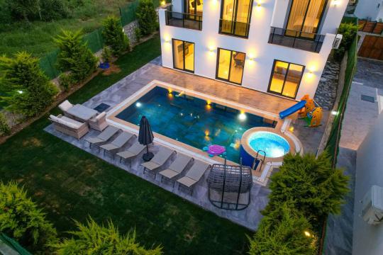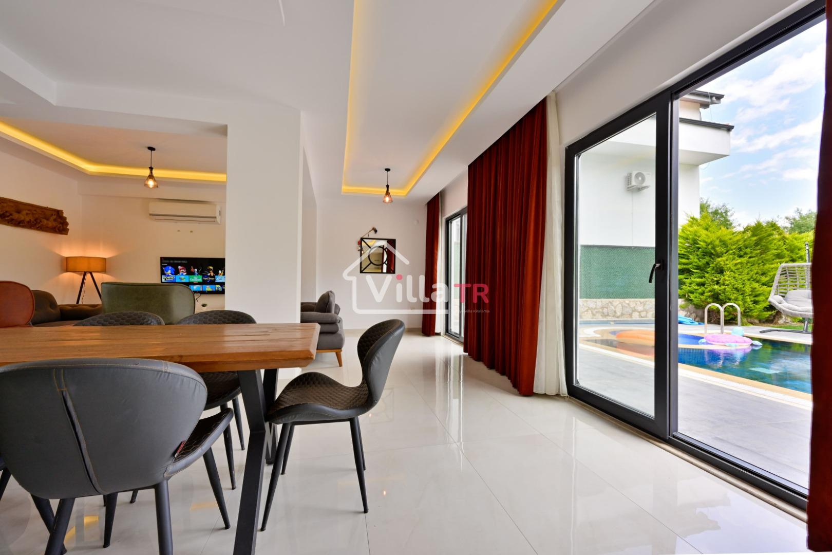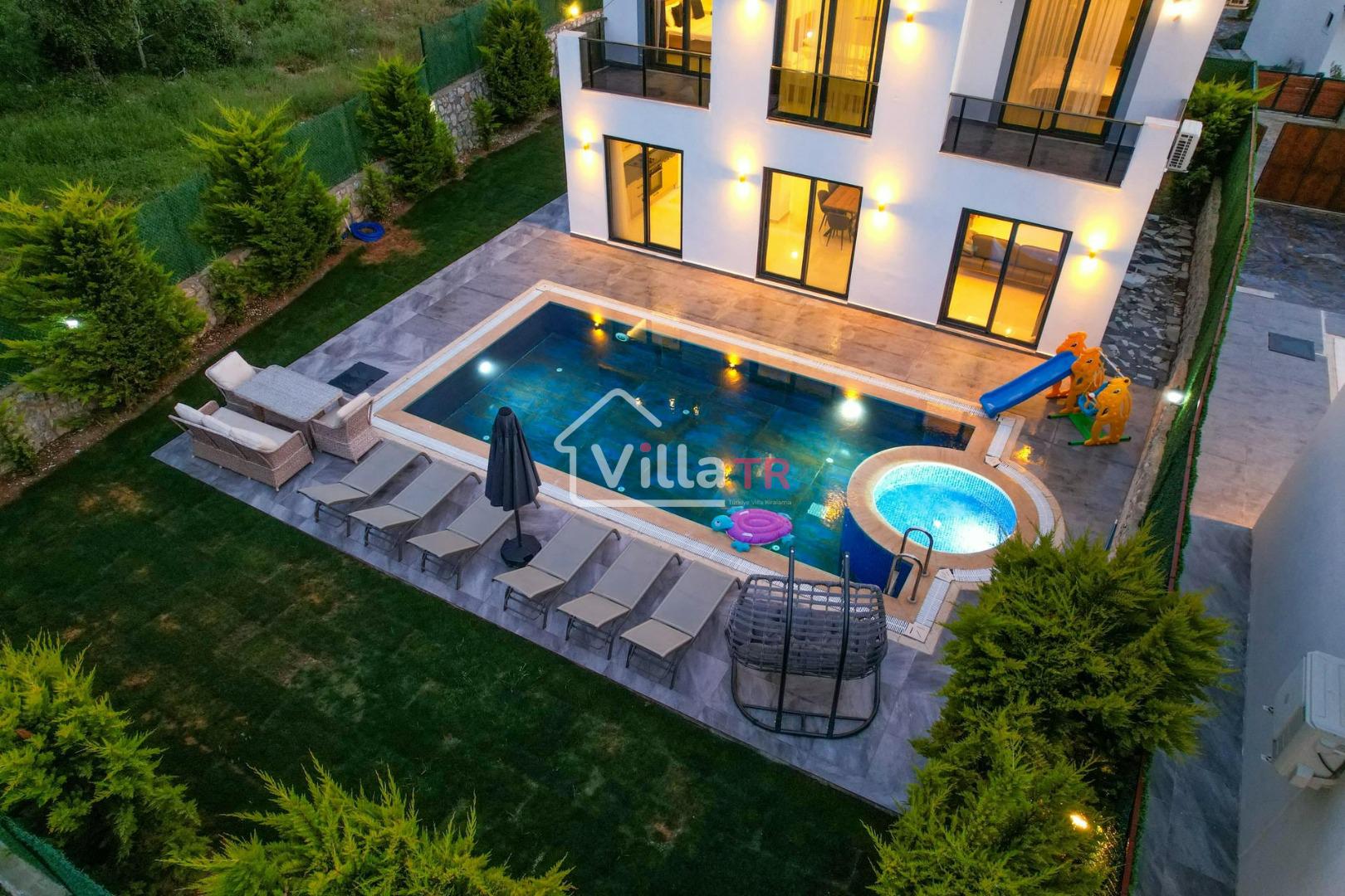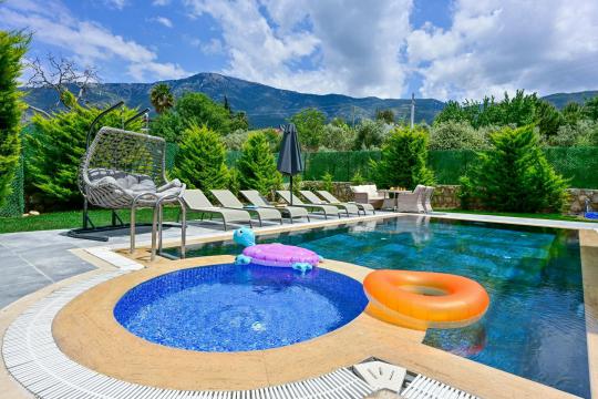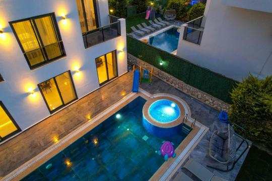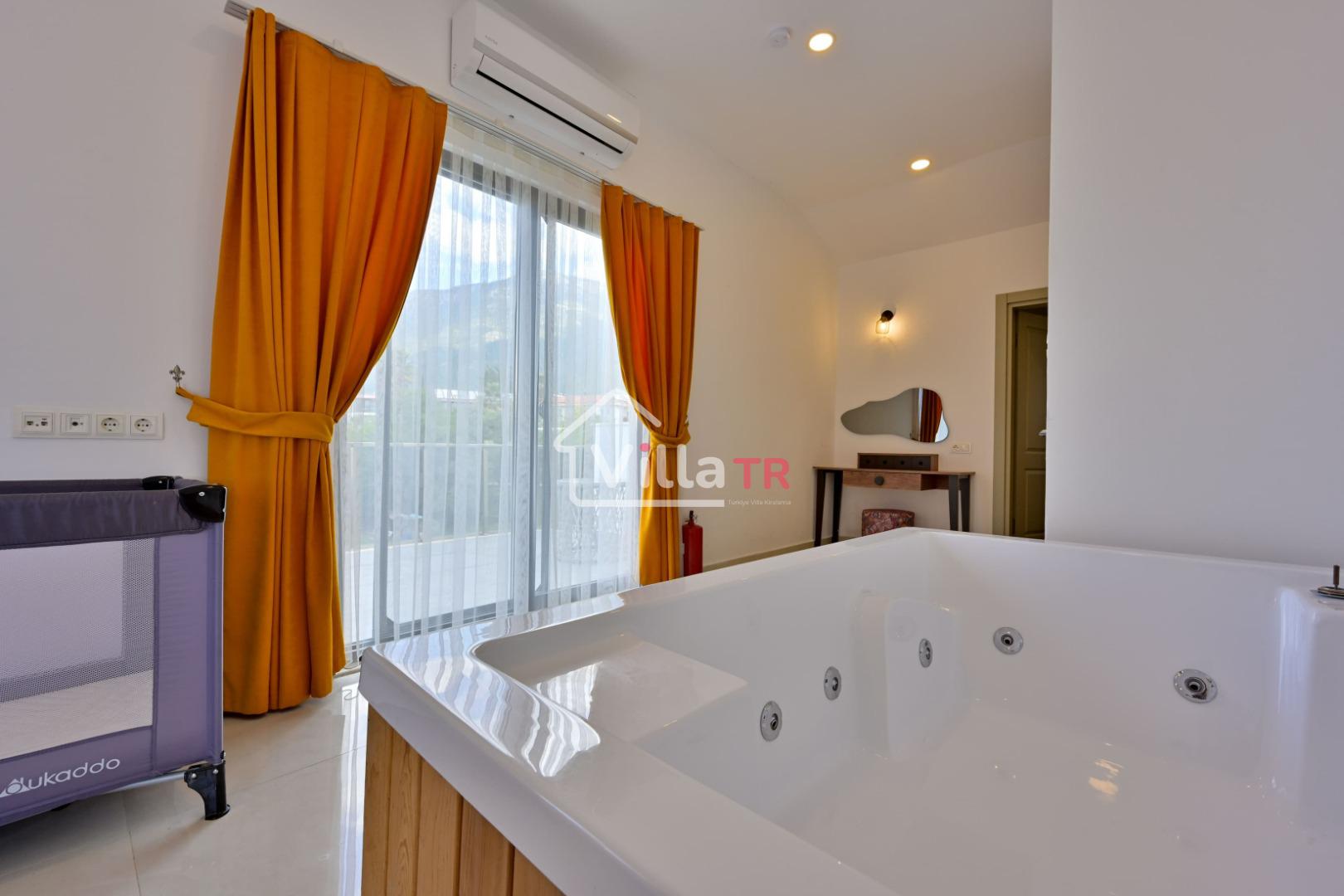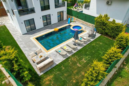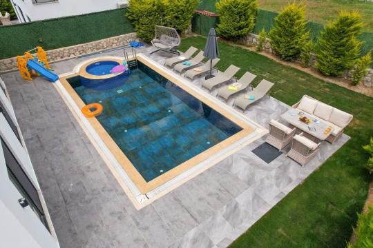 4 yatak odası, 4 banyo tuvalet bulunan villamız 8 kişilik konaklama kapasitesine sahiptir. Geniş bahçesi, 40 m2 büyüklüğünde özel havuzu, bahçe mobilyaları ve barbeküsü bulunmaktadır. Ebeveyn odasında jakuzisi bulunan villamız, Babadağ eteklerinde ki konumu sebebiyle ormanların bol oksijenli esintilerinin bahçenizden eksik olmadığı, şık ve kullanışlı dizaynı ile kendinizde evinizde hissedeceğiniz bir tatil için tasarlandı. Geniş ve kalabalık ailelerimiz için idealdir
