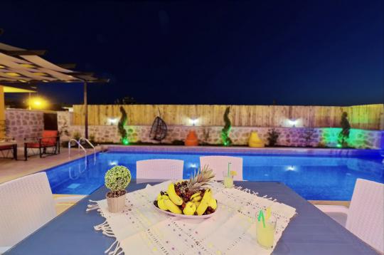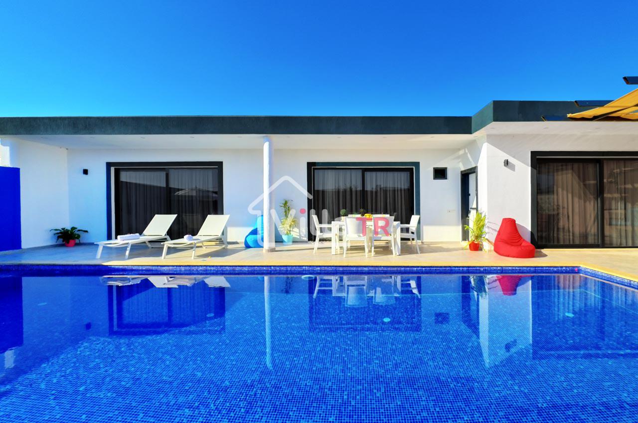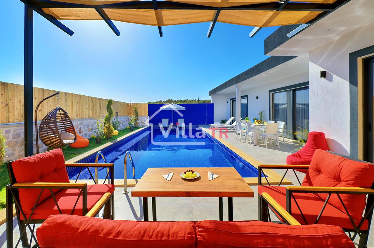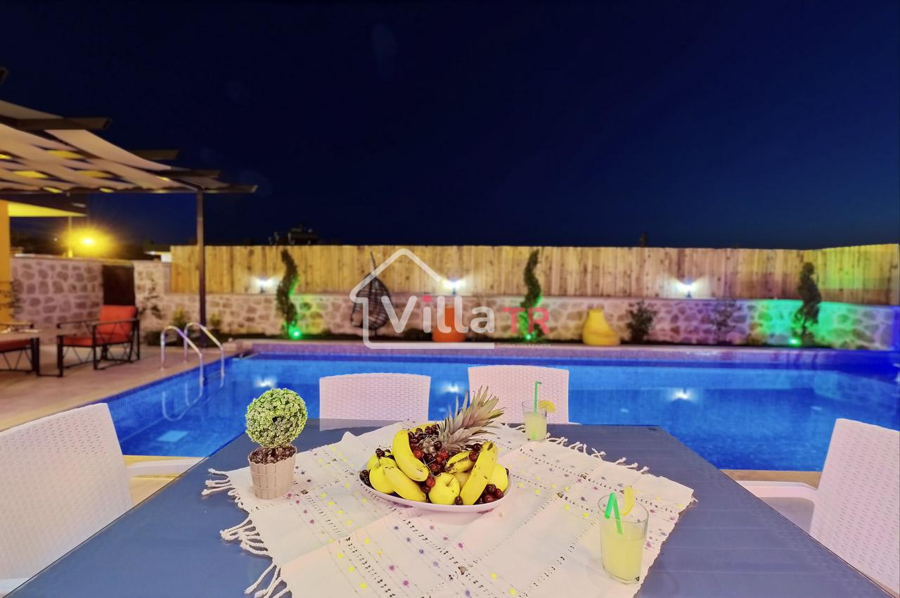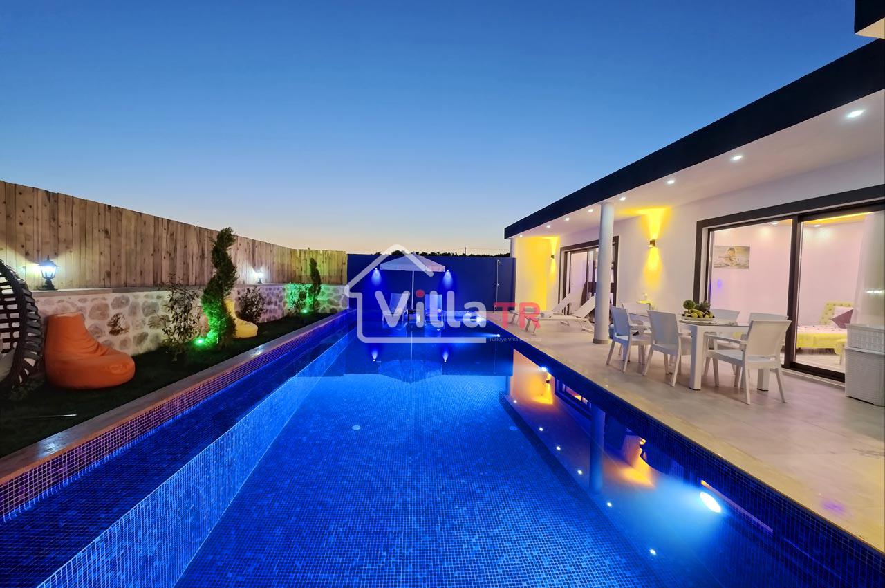 Villa Zeytun, sade eşyalardan oluşan, şık ve kullanışlı bir villadır. Villanın bahçesinden itibaren bütün odaları özenle tasarlanmış ve kullanıcıların en iyi deneyimi yaşayabilmeleri amacıyla dekore edilmiştir. Özel havuzu ve ferah bahçesi ile tatilin tadını çıkarmanıza imkan sağlar. Sevdiklerinizle bahçede havuz keyfi yapabilirsiniz. Özel yüzme havuzunda ferahladıktan sonra bahçedeki şık tasarımlı oturma grubunda güne devam edebilirsiniz. Şemsiyeli şezlong takımı, havuz kenarında bulunan bahçe salıncağı, armut minderler ve çeşitli oturma grupları ile dinlenme alanı alternatifleri zengindir. Havuz çevresindeki loş ve şık aydınlatma sistemi akşamlarınızı keyifli ve huzurlu geçirmenize ortam sağlar. Villada bulunan jakuzi, tatilinize lüks bir dokunuşta bulunur. Full eşyalı ve mobilyalı olan villada klima mevcuttur. Bir araçlık otopark kapasitesi ve kablosuz internet bağlantısı vardır. Villa Zeytun, plaja ve şehir merkezine 15 dakikalık mesafededir. Sağlık merkezi ve marketlere yürüme mesafesindedir. Etrafında kendisine benzer yapıda lüks villalar mevcuttur.